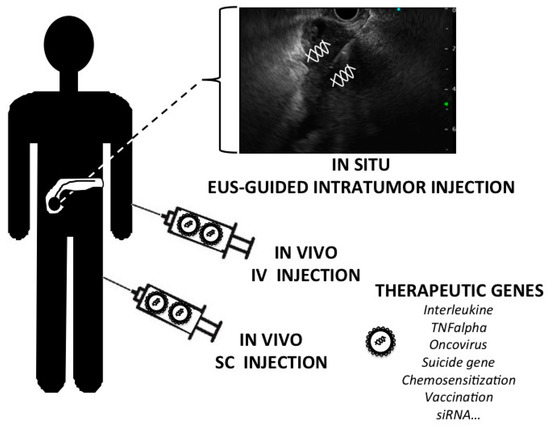 The three main methods are ex vivo, in vivo and in situ gene therapy. Ex vivo gene therapy involves sampling cells from the patient, genetically modifying them with a vector carrying the therapeutic gene and then reintroducing them in the same patient [26]. This method applies very well to blood stem cells as it is clinically used in the gene therapy protocols for combined immunodeficiency syndroms or hemoglobinopathy [27,28]. This strategy requires an ex vivo culture as currently practice in the context of cell therapy with adult stem cell sampling and more commonly in heterologous bone marrow transplantation. This took times and several controls within at least four to eight weeks procedures. In the context of a tumor like PDAC with a rapid growth and invasive process the ex vivo strategy is not adapted and a gene therapy product “ready to use” is theoretically better. The second type of gene therapy is the in vivo approach. It involves injecting the vector carrying the therapeutic gene directly into the bloodstream. In this case, the injection is easy (it is an intravenous or intra-arterial injection) but several additional barriers are raised like the circulating blood and the vessels. Indeed, in the circulating blood, several actors will try to eliminate the foreign DNA and its vector such as macrophages and endonucleases. Finally, if the transgene must reach an organ, it will have to cross the barrier of capillaries and Endothelial cells. The third type of gene therapy is in situ, delivering the therapeutic gene directly within the target tissue (or tumor). This technique is tested in particular in cases of cystic fibrosis (transfer of vectors in the trachea and bronchial network with aerosols), myopathy (for example injection into the muscle of a vector carrying the dystrophin gene in the myopathy of Duchenne) and cancers in order to inject into the tumor a vector carrying a therapeutic gene. This approach requires two things: a good targeting of the organ and an efficient vectorisation system. In terms of targeting, these are mainly “physical” methods that can be carried out by the hand of doctors or surgeons by means of a simple needle or catheters. In case of PDAC, therapeutic gene injection is guided by surgeon during laparotomy, by the radiologist under ultrasound or CT-scan and last (and better) by a gastroenterologist under EUS which is the most precise technique to target primary PDAC whatever its localization within the pancreatic gland.