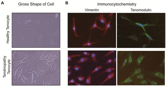 Identification of healthy and tendinopathy tenocytes. Under light microscopy, the morphology of cells from each group was observed (A); The morphology of the tendinopathy group had short elongated processes with more round or oval nuclei compared to the cells from healthy group (A,B); Cells from healthy and tendinopathy tenocyte cultures stained with immunocytochemical methods (B). The majority of cells expressed the surface marker for vimentin (red) and tenomodulin (green). The cells are counterstained with DAPI to mark the nuclei (blue). Original magnification: 400× for A and B; DAPI: 4′,6-diamidino-2-phenylindole dihydrochloride.