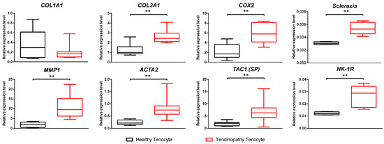 Differential gene expressions between healthy tenocyte and tendinopathy tenocyte. Relative expressions by qRT-PCR of 8 genes were analyzed using cultured tenocytes. Results show that levels of COL3A1, MMP1, COX2, SCX, ACTA2, TAC1 (SP), and NK-1R were significantly increased in the cells cultured from tendinopathy tenocyte. However, COL1A1 was decreased in the cells cultured from tendinopathy tenocyte without statistical significance. The result was expressed as the relative expression level. Data were normalized on GAPDH mRNA levels. Boxplot showing the median along with the first and third quartiles. Error bar means data range from minimum to maximum. ** p < 0.01. SP: substance P; qRT-PCR: quantitative real time-polymerase chain reaction results.