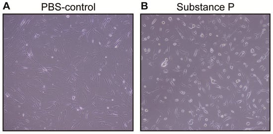 It was suggested that SP could stimulate healing by enhancing cellular proliferation of fibroblasts, myofibroblasts, and stem cells, as well as increase collagen formation in skin, tendon, and corneal injuries [19,20,21,22,23,24] SP also enhances angiogenesis, vasopermeability, and the synthesis of various cytokines [24,25,26,27,28]. However, although SP induces cell proliferation for tissue healing, it was also recently reported that SP is one of the causes of tendinopathy. Fong et al. applied SP to healthy tenocytes and analyzed the changes in collagen remodeling [6]. The authors indicated that SP could be initially beneficial for tendon healing, but with sustained upregulation of SP, excessive collagen remodeling may ensue and lead to the progression of tendinopathy. These results collectively reinforce the idea that SP plays a biological role in tissue injuries.