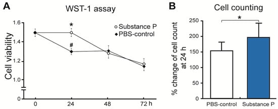 Increased cell viability and proliferation by SP in the cultured tenocytes from healthy tendon. The healthy tenocytes were cultured in medium containing SP or PBS to compare their effects on cell viability and proliferation. Then, cell viability and proliferation were monitored using Cell Counting Kit-8 assay for 72 h. At 24 h, cell viability was significantly higher in the SP group compared to the PBS-control group. However, there were no differences between the groups with and without SP at 48 h (A); The percent change of cell number compared to 0 h was calculated by hemocytometer 24 h after PBS or SP treatment. The result showed significantly higher percent increase of cell number in the SP-group compared to PBS-control (B). Each value represents the mean ± standard deviation. # p < 0.05 compared to 0 h, * p < 0.05 compared to PBS-control group at the same time point. WST-1: 2-(4-iodophenyl)-3-(4-nitrophenyl)-5-(2,4-disulfophenyl)-2H-tetrazolium; PBS: Phosphate buffered saline; SP: substance P.