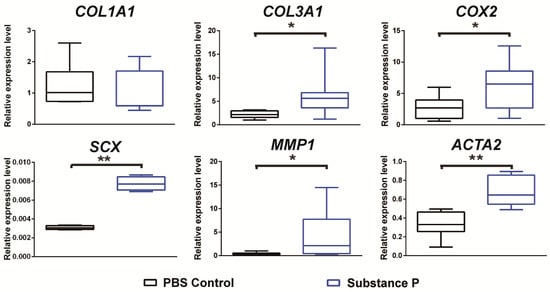 SP upregulation of genes related to tendinopathy. To determine the effects of SP on the development of tendinopathy, cultured healthy tenocytes were pretreated with or without SP 10−7 M for 24 h. Results show that healthy tenocytes developed similar gene expression trends as that of the tendinopathy tenocyte. Levels of COL1A1 decreased but COL3A1, COX2, SCX, MMP1, and ACTA2 were significantly increased as a result of treatment with SP. The result was expressed as the relative expression level after normalizing on GAPDH mRNA levels. Boxplot showing the median along with the first and third quartiles. Error bar means data range from minimum to maximum. * p < 0.05; ** p < 0.01; SP: substance P.