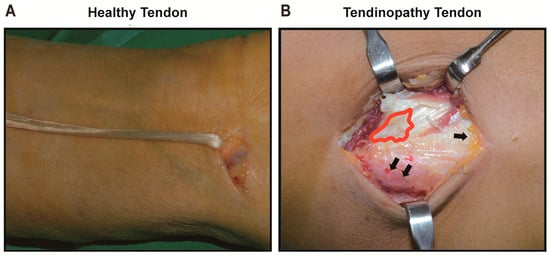 Intraoperative photos of a healthy tendon and a tendinopathy tendon. Healthy tendon was harvested during the anterior cruciate ligament reconstruction or PL tendon during tendon graft procedures and used as the healthy control (A); The origin of extensor carpi radialis brevis (ECRB) tendon from lateral epicondylitis patient was harvested as tendinopathy tendon. Note the white-grayish discoloration and friability with fibrosis, both of which are indicative of degeneration (red line) (B). Arrow indicates the subcutaneous adipose tissue and the tissue of musculotendinous junction. PL: Palmaris longus; ECRB: Extensor carpi radialis brevis.