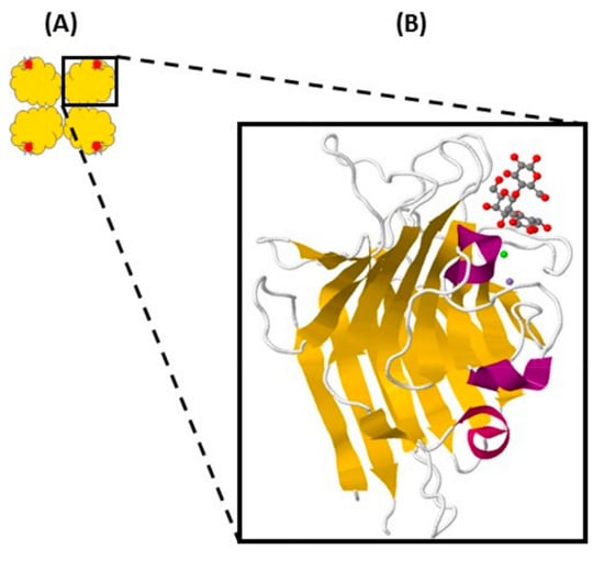 Overall structure of legume lectins. (A) tetramer with carbohydrate recognition domains (red); (B) amplified image of monomer with β-sheets (yellow), α-turns (purple), metal binding sites (area with green and gray spheres) and carbohydrate recognition domain (area occupied by the grey and red molecule). Image modified from Protein Data Bank (accession code 1GZ9).