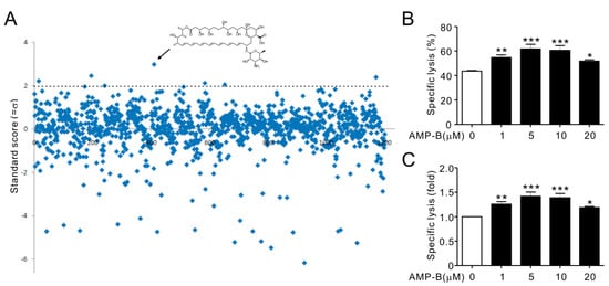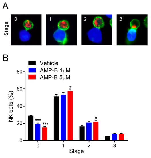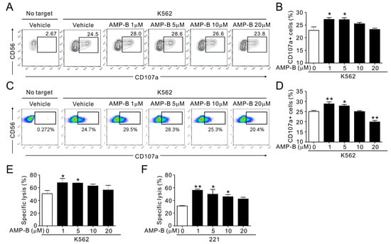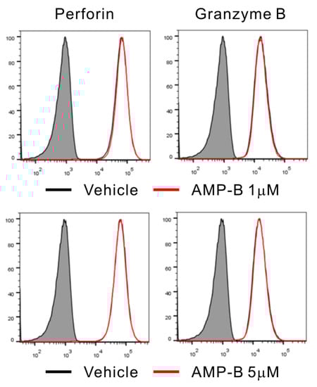 17]. In that study, the repression was significant at relatively high concentrations of AMP-B (5–10 mg/L, approximately 5.4–10.8 µM), which is compatible with our results using human primary NK cells despite some differences in NK cell activation between mice and men [