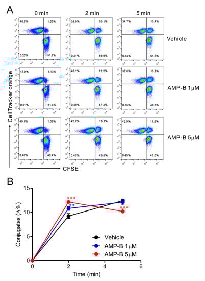 g for 3 min and then incubated at 30 °C for the indicated times. Thereafter, cells were moved to ice, fixed in PBS containing 4% paraformaldehyde, and washed twice with FACS buffer. Conjugates (CFSE+CMTMR+) were detected by flow cytometry.