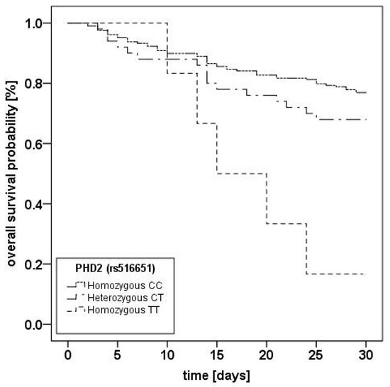 Kaplan–Meier plot of 30-day mortality of acute respiratory distress syndrome (ARDS) patients stratified for PHD2 (rs516651) genotypes. Kaplan-Meier estimators for the three subgroups for 264 patients. CC = homozygous CC-genotype (n = 208); CT = heterozygous CT-genotype (n = 50); TT = homozygous TT-genotype (n = 6). For 8 patients, genotyping results were unclear and patients were excluded from analysis; log-rank-test: p = 0.001.