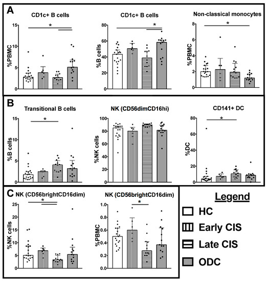 There were no detectable differences between the four groups (HC, ODC, and two CIS groups) in total monocytes, total DCs, total B cells or total NK cells as a frequency of PBMCs (Table A2). However, when investigating subsets of these cell types, alterations in several NK, B cell and DC subsets in samples from the late CIS individuals were observed, shown in Figure 1 and Table A2. In particular, the late CIS group had significantly lower frequencies of CD56brightCD16loNK cells (% NK cells; Figure 1) compared with early CIS or HC patients.