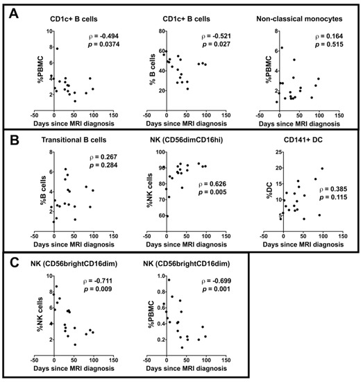 Correlations between time since diagnostic magnetic resonance imaging (MRI) and cell subsets in CIS previously shown to be significantly different to HC in Kruskal Wallis tests. (A) Cell types that were significantly altered compared with HC in ODC; (B) Cell types that were significantly increased from HC in the late CIS group; (C) Cell types that were significantly decreased from HC or early CIS in the late CIS group. Correlations are shown by ρ and p values from Spearman correlation tests.