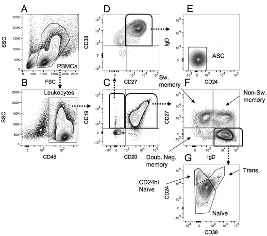 The gating strategy applied to peripheral blood mononuclear cells (PBMCs) analysed for B cell subsets. (A) PBMCs were selected according to forward scatter (FSC)/side scatter (SSC) profile; (B) Leukocytes were identified based on CD45 expression; (C) CD19+CD20− B cells were separated from double positive and CD19− cells; (D) CD19+CD20− B cells that were positive for CD27 and CD38 were selected as probable antibody secreting cells; (E) Identification of antibody secreting cells (ASC) was confirmed from negative expression of CD24 and IgD; (F) Double positive B cells identified in C were separated into switched memory, non-switched memory and double negative memory B cells using CD27 and IgD expression; (G) IgD+CD27− cells in F were separated into naïve B cells (all CD38−/low), CD24hi naïve and transitional B cells using CD38 and CD24 expression.
