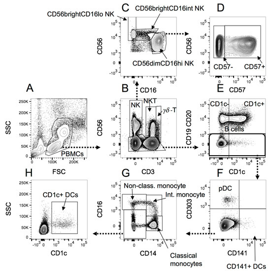 The gating strategy applied to PBMCs analysed for monocytes, NK cells and DCs. (A) PBMCs were selected according to the forward scatter (FSC)/side scatter (SSC) profile; (B) NK cells, NKT and γδ-T cells were separated from CD56− cells, and from one another according to CD3 staining; (C) NK cells gated in B were separated into CD56brightCD16lo, CD56brightCD16int and CD56dim cells, according to CD16 and CD56 staining; (D) CD56dim NK cells were further separated into CD57+ or CD57− according to CD57 expression; (E) B cells were separated from non-B cells in the non-NK, NKT or γδ-T cell CD56- category identified in B. B cells were also divided into CD1c+ or CD1c− populations; (F) Non-B cells identified in E were divided into CD141+ myeloid DCs (mDC2), CD303+ plasmacytoid DCs (pDCs), or other cells. (G) Cells negative for CD141 and CD303 staining in F were separated based on CD16 and CD14 expression into classical (CD14hiCD16−), intermediate (CD14+CD16+) and non-classical (CD14loCD16+) monocytes (reference [23]), as well as CD14−CD16− cell types; (H) The CD14−CD16− cells identified in G were gated on CD1c+ to identify CD1c+myeloid DCs (mDC1).