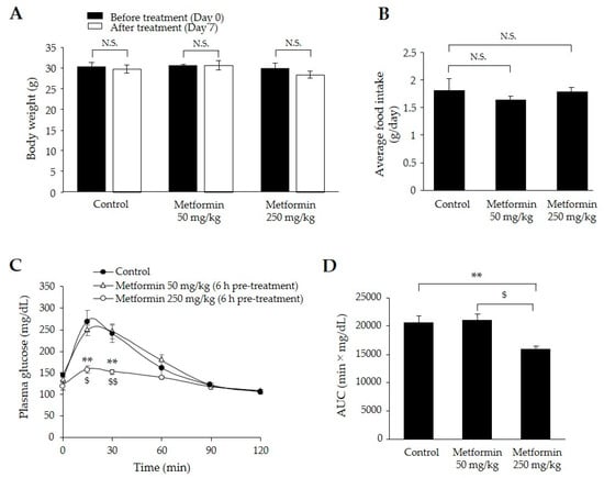 To determine the effective doses of metformin on glucose-lowering effect, we administered two different doses (50 and 250 mg/kg) for one week in mice fed a high-fat diet (HFD) for three weeks. There were no significant differences in body weight or food intake among the control, 50 mg/kg metformin treatment and 250 mg/kg metformin treatment groups (Figure 1A,B). After administration of two different doses of metformin for one week, we performed 1 g/kg oral glucose tolerance tests (OGTTs) in HFD-fed 129S mice. The 250 mg/kg metformin group displayed significantly lower plasma glucose concentrations at 15 and 30 min after glucose-loading than those in the control and 50 mg/kg metformin groups (p < 0.01) (Figure 1C). The mean OGTT area under the curve (AUC) in the 250 mg/kg metformin group was approximately 20% lower than those in the other groups (p < 0.01) (Figure 1D). Based on these results, we selected the 250 mg/kg metformin dose for further evaluation of lipid metabolism.