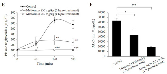 Pre-treatment with 250 mg/kg of metformin 6 h before the oral lipid tolerance tests (OLTTs) resulted in approximately 60% lower plasma triglyceride concentrations at 120 and 180 min compared with those in the control group (p < 0.01) (Figure 1E). Surprisingly, pre-treatment with 250 mg/kg of metformin 1 h before the OLTTs resulted in no increase in plasma TG levels during the OLTTs and the lowest AUC values among the three groups (p < 0.001) (Figure 1F).