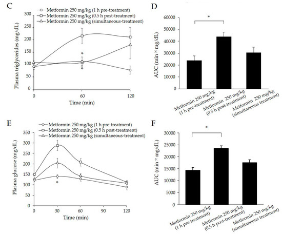 To assess efficacy of the timing of metformin administration for postprandial TG levels, metformin (250 mg/kg) was administered 1 h before and 0.5 h after olive oil-loading. In contrast to pre-treatment, post-treatment of metformin displayed a two-fold increase in plasma TG concentrations 60 min after olive oil-loading (Figure 2C). The simultaneous treatment of metformin resulted in similar suppression of plasma TG concentrations 60 min after olive-oil loading, but a gradual increase at 120 min (Figure 2C). AUCs in the pre-treatment group were approximately 45% lower than those in the post-treatment group (p < 0.05) (Figure 2D). In OGTT, single metformin pre-treatment also significantly lowered plasma glucose concentrations than post-treatment (p < 0.05) (Figure 2E). AUCs in the pre-treatment group were approximately 40% lower than those in the post-treatment groups (Figure 2F). The simultaneous treatment of metformin showed intermediate levels of plasma glucose between post- and pre-treatments (Figure 2E,F).