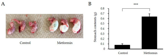 Stomach size and stomach content weights after olive oil administration in 129S mice following metformin (250 mg/kg) treatment (A,B). Data represent means ± SE. n = 4/group; *** p < 0.001.