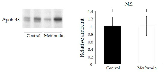 ApoB secretion from primary small intestinal enterocytes was measured as previously described with minor modifications [34]. Briefly, olive oil (0.4 mL) was orally administered 1 h after administration of a single-dose of metformin. The small intestine was extracted and cut into 2 × 2 mm2 fragments. Fragment were incubated in ice cold MatriSperse Cell Recovery Solution (Corning, #354253, Corning, NY, USA) at 4 °C for 8 h without agitation. The obtained fragments were transferred to a plastic culture dish containing 7 mL of ice-cold MatriSperse Cell Recovery Solution and incubated at 4 °C for 8 h without agitation. The dish was then gently shaken to separate the villi, and the villi suspension was washed twice in ice-cold PBS (−) (180 g, 5 min). After the final spin, the villi were resuspended in Dulbecco’s Modified Eagle’s medium with 10% fetal bovine serum and 0.2 U/mL insulin in the culture dishes (1 × 106 cells/well). We measured the amount of apoB-48 (Wako Chemicals Co., #K23300R, Takasaki, Japan) secreted from primary cultured enterocytes into the medium for 120 min after resuspension. Immunoblotting using an apoB-48 antibody was performed on the triacylglycerol-rich lipoprotein fractions by SDS-PAGE analysis.