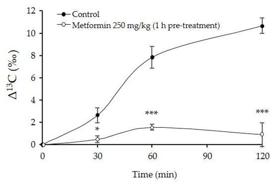 Changes in the 13C/12C ratio in expired CO2 after administration of glyceryl-1-13C tripalmitate in 129S mice following metformin (250 mg/kg) treatment. Data represent means ± SE. n = 5/group; * p < 0.05, and *** p < 0.001.