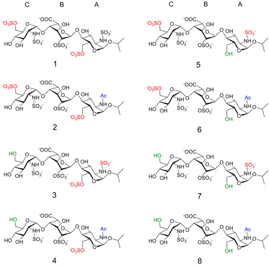 Library of heparin mimic trisaccharides. 1–4 were designed to interact with FGF-1, while 5–8 do not have the group 6-O-sulfate in glucosamine, and were designed to be inactive for the FGF-1—FGFR pathway, but active towards the FGF-2 pathway. We drew the trisaccharides formulae to represent the substituents relative directions in a three-dimensional space. The groups that are kept constant along the whole series are shown in black, and the sulfate groups that are subjected to permutation in red. Rings are labeled from the reducing end by letters A, B and C.