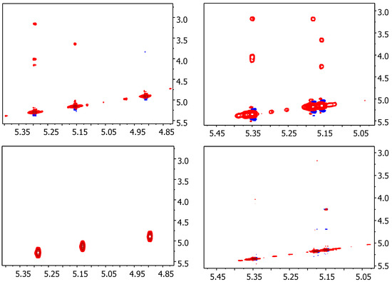 NOESY and transfer NOESY NMR experiments for 4 recorded for NOESY (bottom left), tr-NOESY (top left), and 1 NOESY (bottom right) and tr-NOESY (top right) recorded at 298 K at 600 MHz. Display parameters, low contour level, number of contour levels, and separation between them are the same of all four experiments. Units are in ppm.