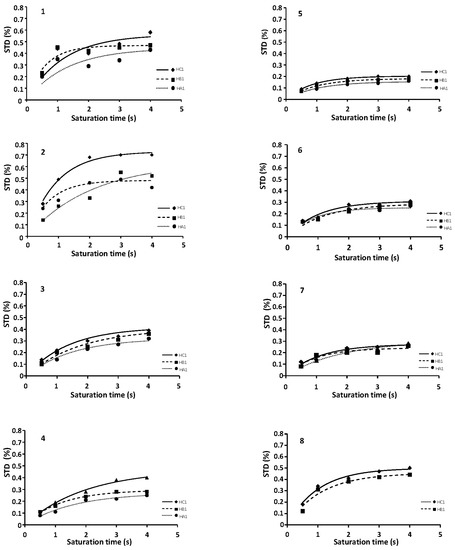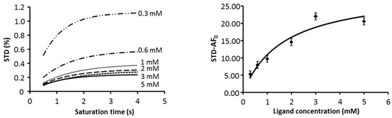 The STD initial rates (STD0) [41] were calculated from the curve of STD vs. saturation time. To do so, we utilized the equation: STD0(t) = a [1 − exp (−bt)], where a represents the asymptotic maximum of the STD build-up curve (STDmax), b is a rate constant that depends on the relaxation properties of a given proton that measures the rate of the STD build-up (Ksat), and t is the saturation time (tsat). The STD0 values were obtained as the product of the ab coefficients [41].