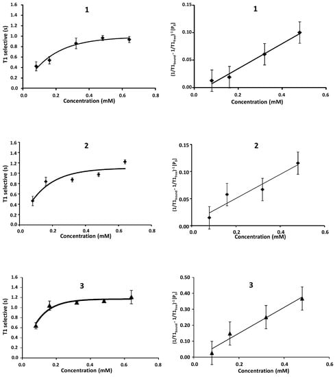 To determine the IC50, we adjusted the experimental values of the intensity signals vs. recovery delays to obtain an exponential function. We obtained the selective T1 value by f(t) = I0 × [1 − a × exp (−t/T1)]. In a ligand-receptor system where the ligand is present in large excess over the receptor binding sites, the ligand relaxation rate is describe by 1/T1obs = 1/T1free + fbound/(T1bound + tbound), where fbound is the fraction bound ([PL]/[L]) and τbound is the lifetime of the bound state. The relationship between total ligand concentration and T1 is then [P]0T1obs = ([L]0 + IC50)(T1bound + τbound), and a plot of [P]0 T1obs versus [L]0 gives a straight line with IC50 obtained from the intercept of the x axis [42].