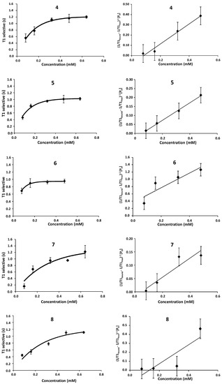 IC50 values using STD-NMR were calculated for compound 1 at different concentrations based on the initial rates of the affinity factor method (Figure 5) [33]. Although an IC50 of 1.70 ± 0.01 mM was obtained, we cannot support the validity of the result due to several drawbacks of the method. In this case, due to the electrostatic nature of the complex, the gap between the protein and the ligand protons is very large, yielding low magnetization transfer values. On other hand, the small binding constant implies a large consumption of trisaccharide due to the high concentration needed to complete a meaningful titration curve. This, together with the large amount of time needed to record the full series of experiments, forced us to consider another method for the estimation of the IC50. Thus, we explored the IC50 calculation using selective T1 at different concentrations (Figure 6) [36]. The results are considerably smaller that those obtained by STD0-AF, see Table 2. Nevertheless, they are in agreement with the values obtained by Yu-Peng et al., when performing the same measure with disaccharides and FGF-2 by ITC [18].