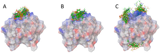 Best docking structures for 1 (A); 4 (B) and 8 (C). Colors in the surface of the proteins are according the electrostatic potential: Red negative and blue positive.