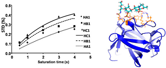 STD-NMR Experiments. All the samples were prepared in 250 μL 5 mM phostate buffer at pH 6.0 and 100 mM NaCl in 99.9% D2O. The concentration of the protein was 19 µM, and the ligand was 1.6 mM. The ratio between the protein and ligand was 1:84. The experiments were performed at 289 K. STD-NMR experiments were carried out with spin-lock to suppress protein signals. Moreover, we tried to suppress the solvent using excitation sculpting with gradients, and we used a shaped pulse train for saturation, alternating between on and off resonance. The on-resonance and off-resonance frequencies were set to 0.7 and 40 ppm, respectively. A spoil sequence was used to destroy unwanted magnetization. The saturation times were 0.5, 1, 2, 3 and 4 s, with an additional delay set to 3.6, 3.1, 2.1, 1.1 and 0.1, respectively, in order to keep the relaxation delay constant at 4.01 s for all experiments. STD NMR experiments were performed with 2048 scans with a total experimental time for every point of 5 h.