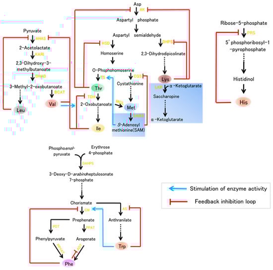 Nine essential amino acids biosynthesis leading to lysine (Lys), methionine (Met),threonine (Thr), phenylalanine (Phe), tryptophan (Trp), valine (Val), isoleucine (Ile), leucine (Leu), and histidine (His) in plants. Enzymes are indicated in yellow text. The catabolism indicated by the light blue boxes. Abbreviations: AK, Asp kinase; HSD, homoserine dehydrogenase; DHDPS, dihydrodipicolinate synthase; LKR, lysine ketoglutaric acid reductase; TS, Thr synthase; CGS, cystathionine γ-synthase; TDH, Thr dehydratase; PRS, ribose-phosphate diphosphokinase; MGL, Met γ-synthase; SAMS, S-adenosylmethionine synthase; AHAS, acetohydroxyacid synthase; KARI, ketol acid reductoisomerase; DHAD, dihydroxyacid dehydratase; BCAT, branched-chain aminotransferase; DAHPS, 3-deoxy-d-arabinoheptulosonate 7-phosphate synthase; CM, chorismate mutase; AS, anthranilate synthase; PDT, prephenate dehydratase; PPAT, prephenate aminotransferase; PPYAT, phenylpyruvate aminotransferase; ADT, arogenate dehydratase.
