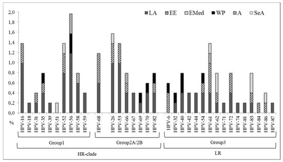 Distribution of HPV types among women (n = 508, excluding 29 women with untyped HPV DNA). LA, Latin America; EE, Eastern Europe, EMed, Eastern Mediterranean; WP, Western Pacific; A, Africa and SeA, Southeast Asia. According to the IARC classification system [16]: Group 1 = carcinogenic to humans; Group 2A (HPV-68) = probably carcinogenic to humans; Group 2B = possibly carcinogenic to humans; Group 3 = not classifiable as carcinogenic to humans.