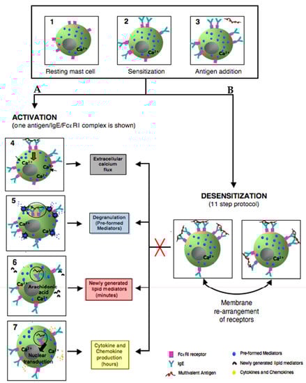 Simplified model comparing the outcomes of activated and rapidly desensitized mast cells. Resting mast cells (1) sensitizes with antigen-specific IgE bound to their high affinity IgE recepors (FcεRI) on cell surface (2) A: following the crosslinking of IgE/FcεRI receptors with an optimal dose of antigen leads to calcium flux (3–4), degranulation with release of the preformed mediators (5), early de novo synthesis of lipid mediators (6), and late cytokines/chemokines production(7). B: following administrating of suboptimal 11 doses to complete the same optimal dose as in A (activation) (3); leads to membrane rearrangements of receptors which impairs Ag/IgE/FcεRI complexes internalization and prevents all the hallmarks of MCs activation (red cross) such as calcium flux, degranulation, lipid mediators, and cytokine production.