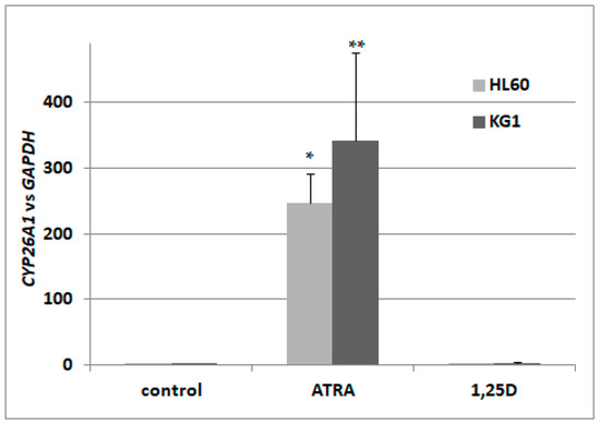 In a search for the sensor of transcriptional activity of RARs, we decided to concentrate on isoforms of CYP26. According to the available literature, CYP26A1 is the most ubiquitously expressed isoform [32], present in HSCs [35], and exhibits the greatest increase upon stimulation with ATRA [36]. Therefore, we wanted to verify that the gene encoding CYP26A1 is upregulated in AML cells in response to ATRA-treatment, and what the kinetics of its activation are. Our initial experiments conducted on HL60 cells revealed that the kinetics of CYP26A1 upregulation are: a slow, significant increase can be seen after 72 h of treatment, and after 96 h, expression is about 200–250 times higher than in vehicle-treated cells. Then we treated HL60 cells with ATRA at concentrations ranging from 10 nM to 1 μM for 96 h. It appeared that at 100 nM we could detect noticeable upregulation of CYP26A1 expression, but in order to obtain significant upregulation, cells had to be exposed to 1 μM ATRA. In our next experiments, HL60 cells were exposed to either 1 μM ATRA or to 10 nM 1,25D. From our past experiments, we know that 10 nM 1,25D significantly upregulates the gene encoding CYP24A1, and that ATRA does not regulate this gene in many different AML cell lines [13]. Now we wanted to determine if 1,25D has any influence on CYP26A1 expression. HL60 cells are very sensitive to 1,25D [12], and are moderately sensitive to ATRA. We also tested how CYP26A1 is regulated in KG1 cells. These cells have higher expression levels of RARA and RARB genes, and a higher level of RARα protein than HL60 [13,37], but they have low expression of VDR [13]. Our experiments showed that the expression of CYP26A1 could be upregulated in HL60 cells by ATRA by up to 250 times, compared to the control cells, but is not regulated by 1,25D. In KG1 cells, ATRA induced upregulation of CYP26A1 as well, and again this gene was not regulated by 1,25D (Figure 1). Therefore we decided to measure levels of CYP26A1 mRNA in order to detect transcriptional responses to ATRA in our next experiments performed using blood cells.