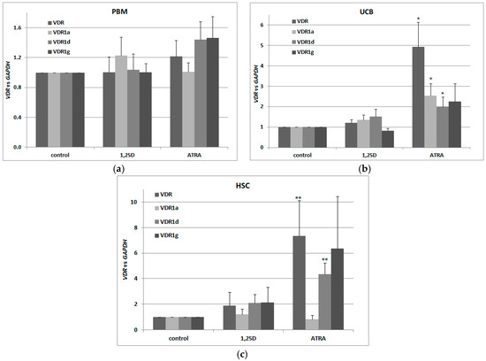 For our experiments, we used three different sets of blood cells. The first set consisted of the mononuclear cells from the peripheral blood of healthy adults (PBM), isolated using Histopaque-based centrifugation. The second (UCB) consisted of mononuclear cells from human umbilical cord blood, which is strongly enriched in HSCs and progenitor cells in comparison to peripheral blood [38]. The third set (HSCs) was up to 95% enriched in CD34+ cells isolated from UCB (efficacy of CD34+ cells isolation is presented in Figure A2). All three transcriptional variants were present in human blood cells, however only in UCB and HSC cells were VDR and its transcriptional variants regulated by ATRA (Figure 2a–c). Our results suggest that there also exist other transcriptional variants of VDR in addition to the tested ones. This is because, the regulation of total VDR transcripts in response to ATRA is stronger than the regulation of specific transcripts identified in our earlier studies.