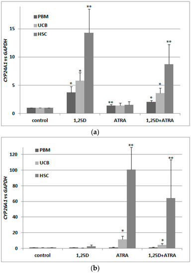 Next, we wanted to verify whether VDR transcripts in these cells are translated into a transcriptionally active VDR protein. This is why we exposed the blood cells to 10 nM 1,25D and/or 1 μM ATRA and tested expression of CYP24A1 in these cells. As presented in Figure 3a, 1,25D caused an upregulation of CYP24A1 mRNA levels, but co-treatment with 1 μM ATRA did not cause further upregulation. This shows that ATRA-induced upregulation of VDR transcription was not followed by an increase in transcriptionally active VDR protein. Then, we wanted to verify that ATRA did, indeed, activate RARs in these cells. This is why we checked the expression of CYP26A1 in blood cells exposed to 1 μM ATRA for 96 h. As presented in Figure 3b, transcriptional activity in response to ATRA was very high in HSCs, and moderate in UCB cells. In PBM cells from healthy adults, ATRA did not cause upregulation of CYP26A1, which might indicate that RAR receptors are not present in these cells. This might also explain the lack of regulation of VDR in response to ATRA in PBM cells presented in Figure 2a. CYP26A1 in normal blood cells was not upregulated in response to 1,25D (Figure 3b).