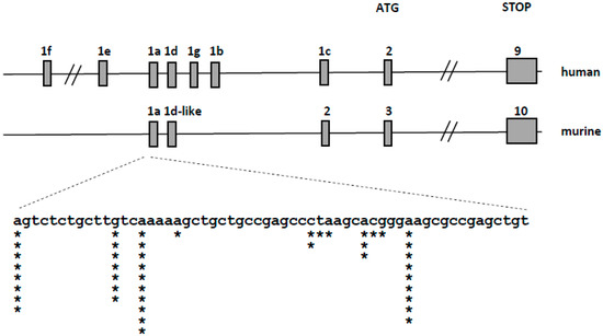 The murine VDR gene is located on chromosome 15, and its composition is less complex than in humans. In the 5’ UTR region of VDR gene, exons 1 and 2 were identified, which show strong homology to human 1a and 1c, respectively [27]. Although exon 1d is well conserved (1d-like), transcripts containing this exon have not been reported in mice. The sequence similarity of the exons 1f and 1b is low between man and mice. Translation of mouse VDR protein starts from exon 3 [28]. It has been shown that transcription of VDR is upregulated in response to 1,25D in murine osteoblasts [29,30].