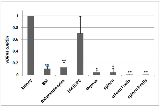 Knowing that there is only one transcriptional variant of VDR gene present in C57BL/6 mice, we decided to test its basic expression in different tissues. We used kidneys as a reference 1,25D-responsive organ, therefore we normalized expression of VDR in remaining tissues to the expression measured for kidneys. We used pooled bone marrow cells (BM), bone marrow granulocytes isolated using CD45/SSC-based sorting (BM granulocytes), hematopoeitic stem and progenitor cells isolated from bone marrow (BM HSPC), pooled thymocytes isolated from thymus, pooled spleen cells, spleen T cells isolated using anti-CD3 and spleen B cells isolated using anti-CD19 antibody. Indeed, the expression of VDR appeared to be the highest in kidneys, and in all other tissues tested it was significantly lower except of BM HSPC. The results are presented in Figure 5.