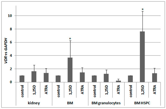 Our next goal was to verify whether, in murine blood cells, VDR expression is regulated by ATRA in a similar manner to human blood cells. Since previous reports indicated a 1,25D-induced regulation of VDR in murine osteoblasts [29,30], we decided to also test this compound. Therefore we took different fractions of cells from bone marrow, and kidney cells as a control of 1,25D-responsive tissue, and exposed them ex vivo to either 10 nM 1,25D or to 1 μM ATRA for 96 h, and then we measured the levels of VDR mRNA relative to glyceraldehyde 3-phosphate dehydrogenase (GAPDH) expression. In kidneys, expression of VDR was not regulated to a significant degree by either of the compounds used. In pooled BM cells, there was significant upregulation of VDR expression in response to 1,25D, which was not present in BM granulocytes. The strongest and the most significant upregulation of VDR expression in response to 1,25D was detected in BM HSPC. ATRA did not regulate VDR expression in all of the cells tested (Figure 6).