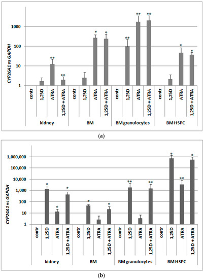 Since in murine blood cells an expression of VDR was not regulated by ATRA as in human blood cells, we hypothesized that RARs might not be present in these cells. Since RARs are ligand-activated transcription factors, and ATRA is a universal ligand for all RAR isoforms, we decided to test expression of CYP26A1 as a RAR-target gene. Again, we took different populations of cells from bone marrow and kidney cells, and exposed them ex vivo to either 10 nM 1,25D or/and to 1 μM ATRA for 96 h. After ex vivo stimulation, mRNA was isolated from the cells, the expression of CYP26A1 was tested, and GAPDH expression was used as a reference. Relative expression of CYP26A1 in control cells (exposed to vehicle) was calculated as 1. As presented in Figure 7a, CYP26A1 was upregulated in all samples exposed to ATRA; the highest and most significant upregulation was observed in pooled BM cells and in BM HSPC. These results indicate that RARs are expressed in BM and specifically in HSPC, and are transcriptionally active.