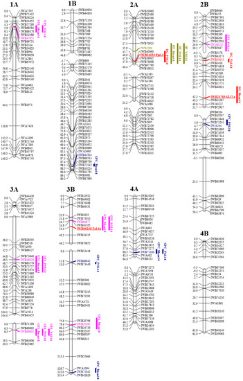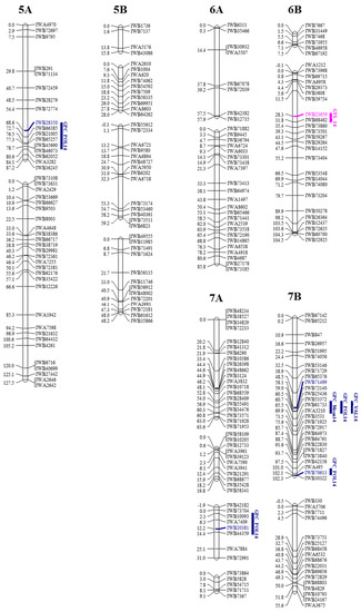 - Bӧrner, A.; Schumann, E.; Furste, A.; Coster, H.; Leithold, B.; Rӧder, M.S.; Weber, W.E. Mapping of quantitative trait loci determining agronomic important characters in hexaploid wheat (Triticum aestivum L.). Theor. Appl. Genet. 2002, 105, 921–936. [Google Scholar]