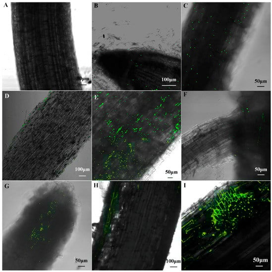 Colonization of the GFP-labeled cells in maize root. (A) Non-inoculated control plant; (B–D) Colonization patterns of the GFP-labeled Paenibacillus sp. B1 in maize root after one day of inoculation; (E–G) Colonization patterns after three days of inoculation; (H,I) Colonization patterns after five days of inoculation. Green dot represents the GFP-labeled Paenibacillus sp. B1.