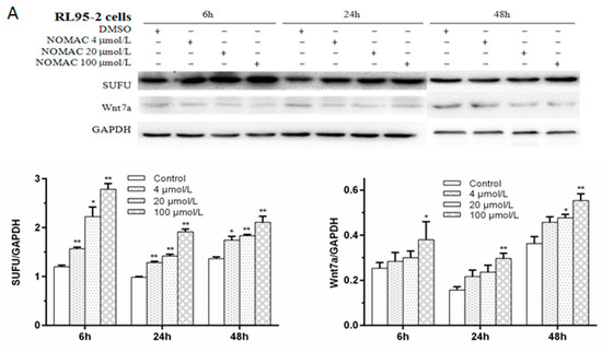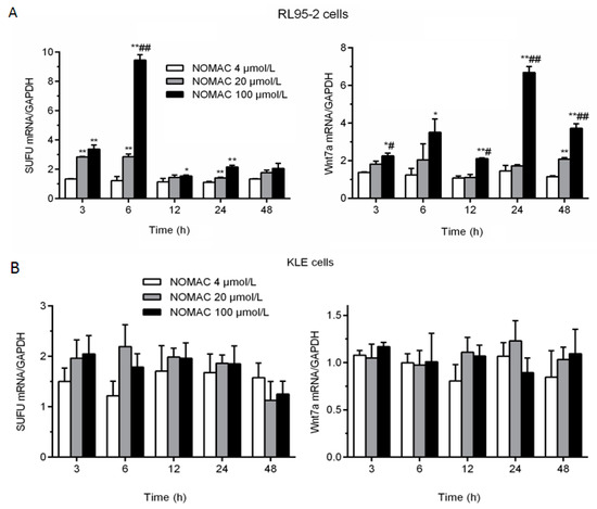 2.4. Effects of NOMAC on the mRNA Levels of SUFU and Wnt7a in RL95-2 and KLE Cells