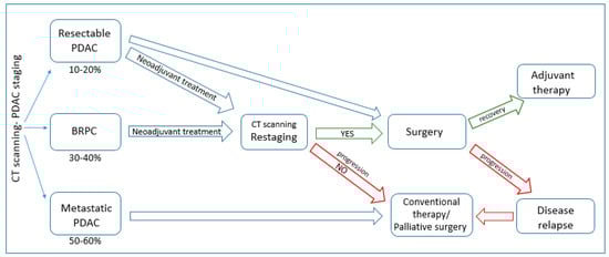 Surgery followed by adjuvant therapy has been shown to provide slight, but significant survival benefit for non-metastatic patients in several phase III studies. Thus far, gemcitabine and 5-FU-based postoperative chemoradiation has been considered as standard of care, improving the median OS time for 2–5 months [,]. However, adjuvant therapy remains a controversial field, with results obtained in clinical trials ranging from definite survival benefit [] to negative impact on patients’ OS []. In addition, almost 60% of resected patients present early tumour progression or prolonged recovery, disabling planned postoperative treatment. Therefore, if no distant metastasis has been detected during cancer diagnosis and staging, the recommended first line treatment is neoadjuvant chemotherapy. This therapy aims to enhance drug delivery and tumour oxygenation and minimise tumour burden, which may result in downstaging and more definite surgical resection [] and reduce the risk of tumour implantation during pancreatectomy []. Preoperative treatment might also avoid the delay between the diagnosis and the start of postoperative treatment, usually caused by patient’s prolonged recovery, and enable treatment of early micrometastases []. In addition, higher number of patients may benefit from this treatment compared to patients profiting from adjuvant therapies, which sometimes need to be postponed or cancelled due to postoperative complications, prolonged recovery or early recurrence [,]. Cancer chemo-sensitivity might be also determined. However, neoadjuvant treatment also raises several concerns, such as disease progression during preoperative treatment or possible increase in surgical complications. Nevertheless, no difference in morbidity or mortality has been observed so far between patients subjected or not to preoperative treatment []. On the other hand, neoadjuvant therapy may avoid unnecessary surgery in patients, whose disease progressed during the treatment, therefore selecting a subpopulation of patients that might benefit from further therapy [,]. However, this aspect remains debatable. Different approaches for preoperative therapy, such as chemoradiation, chemotherapy followed by radiotherapy or chemotherapy alone have been considered, even though none of the strategies showed considerable superiority. The optimal therapy, its duration and the most adequate time for its initiation still need to be determined. Thus far, there has also been no consensus on the advantage of preoperative over postoperative treatment, making the use of this therapy controversial.