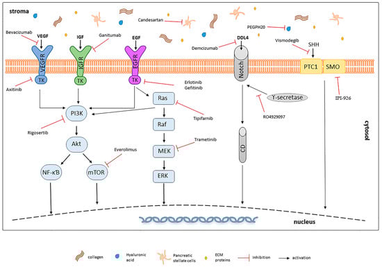 EGFR belongs to ErbB family of receptors, containing a tyrosine kinase domain, which activation is involved in regulation of key processes such as cell cycle, cell survival and differentiation through activation of multiple downstream signalling pathways, including RAS/PI3K/Akt or MAPK/ERK. EGFR pathways are over-activated in PDAC as a consequence of high receptor density, overexpression of ligands or EGFR activating mutations []. Considering the high prevalence of EFGR mutations in pancreatic cancer patients and the success of erlotinib, an adenosine triphosphate (ATP) competitor for binding to tyrosine kinase (TK) domain, as a PDAC therapeutic, other molecules targeting this pathway have been intensely tested. Both antibodies blocking EGFR activation and inhibitors of tyrosine kinase domain of the receptor have been evaluated. However, most of them failed to show any improvement over the standard treatment. As an example, cetuximab, an EGFR-binding monoclonal antibody, showed promising phase I results in combination with capecitabine but revealed no statistical significance in survival benefit in further studies []. Gefitinib treatment combined with gemcitabine was also evaluated and resulted in 1 year survival rate of 27% and median survival time of 7.3 months []. Although encouraging, gefitinib has been considered not as promising as erlotinib. Therapies designed for patients harbouring human epidermal growth factor receptor 2 (HER-2) mutations emerged as another possibility. It has been demonstrated that more than 10% of PDAC patients overexpress HER-2 protein and its expression has been correlated with patients’ poor survival []. Therapy of HER-2 positive patients with capecitabine and trastuzumab, though promising, was unsuccessful in phase II clinical trials []. The main drawback of this study was the small number of patients harbouring HER-2 alterations. After getting FDA approval for chemotherapy, lapatitib has been also tested in combination with gemcitabine for pancreatic cancer patients; however, the results showed only moderate improvement, with a median survival time of four months []. Lapatinib/capecitabine combination has been also tested as second-line therapy for pancreatic cancer. Although the treatment was well tolerated and provided improvement for a subset of patients, the limited number of participants impairs evaluation of its clinical benefit []. Nimotuzumab (anti-EGFR monoclonal antibody) [] and afatinib (TK inhibitor) [] also showed encouraging results in preclinical or clinical studies and their therapeutic application is currently under evaluation. Insulin-like growth factor 1 receptor (IGF1R) is also highly overexpressed in pancreatic cancer and its excessive activation leads to boosted stimulation of downstream pathways, increasing cell proliferation and survival []. Several drugs targeting these molecules, especially monoclonal antibodies ganitumab and cixutumumab have been evaluated; however, no statistically significant improvement of survival was observed []. Similarly, a study on the combination of ganitumab and gemcitabine failed to show significant benefit over the single agent gemcitabine in phase III clinical trial causing the closure of the study [].
