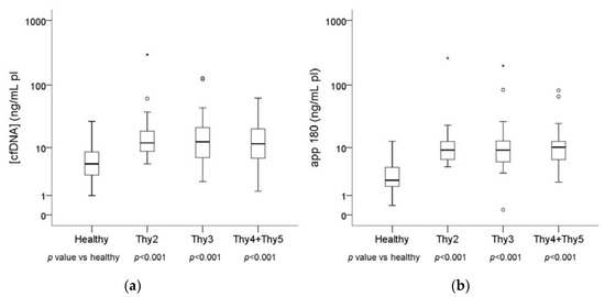 Box plots reflecting the distribution in cases (Thy2, Thy3 and Thy4/Thy5) and controls (healthy subjects) of total cfDNA quantity (a), and cfDNA quantity according to a qPCR assay targeting a 180 bp amplicon on the APP gene (b). Each box indicates the 25th and 75th percentiles. The horizontal line inside the box indicates the median, and the whiskers indicate the extreme measured values. Dots and stars represent outliers.