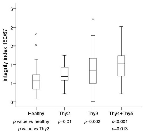 Subjects affected by benign thyroid nodules (Thy2) showed an integrity index significantly lower (p = 0.013) than that found in patients with cytological diagnosis of thyroid cancer (Thy4/Thy5).