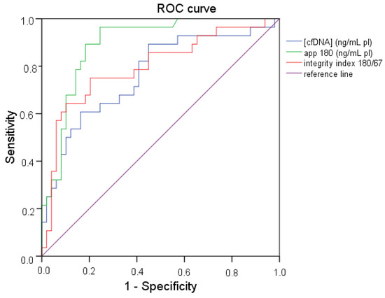 All the three markers showed a good predictive capability with an area under the ROC curve (AUC) of 0.765 (p < 0.001), 0.982 (p < 0.001) and 0.796 (p < 0.001) for cfDNA quantity by 67 bp amplicon, cfDNA quantity by 180 bp amplicon and integrity index, respectively (Figure 4).