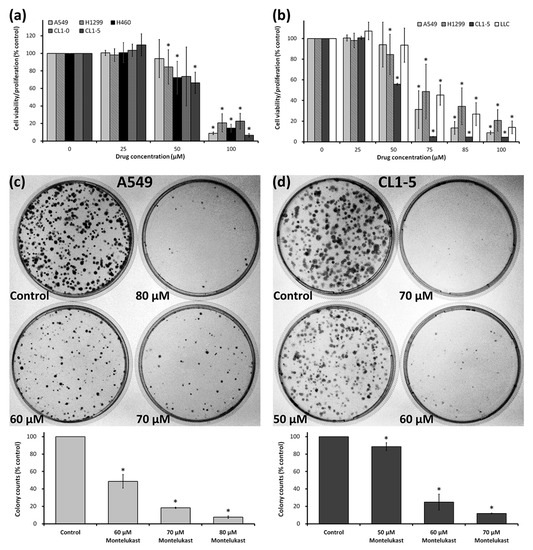 Montelukast inhibited the viability/proliferation of lung cancer cells. (a,b) The cells were treated with various concentrations of montelukast for two days. Cell proliferation/viability was determined by a Premixed Water-Soluble Tetrazolium Salt-1 (WST-1) Cell Proliferation Assay; (c,d) after being treated with various concentrations of montelukast for a day, the cells (A549 and CL1-5) were incubated for nine days and the colonies on each dish were counted. All results were expressed as the mean ± SD of independent experiments performed on different days. * p < 0.05, as compared with the corresponding control (0 μM) group.