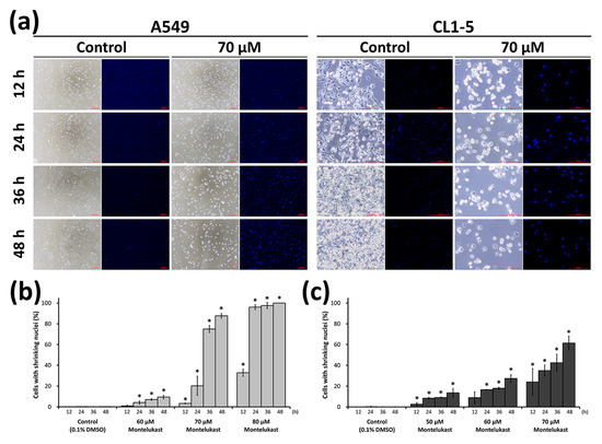 Montelukast-induced cell death of lung cancer cells. After being treated with various concentrations of montelukast for the indicated time (12, 24, 36, or 48 h), the cells (A549 and CL1-5) were observed with light microscopy and fluorescence microscopy (4’,6-diamidino-2-phenylindole (DAPI) staining). (a) Representative photographs of the cells were shown (The detailed photographs are presented in Figure S1); (b,c) The percentages of A549 (b) and CL1-5 (c) cells with shrinking nuclei were calculated. All results were expressed as the mean ± SD of three independent experiments performed on different days. * p < 0.05, as compared with the corresponding control (0 μM) group.