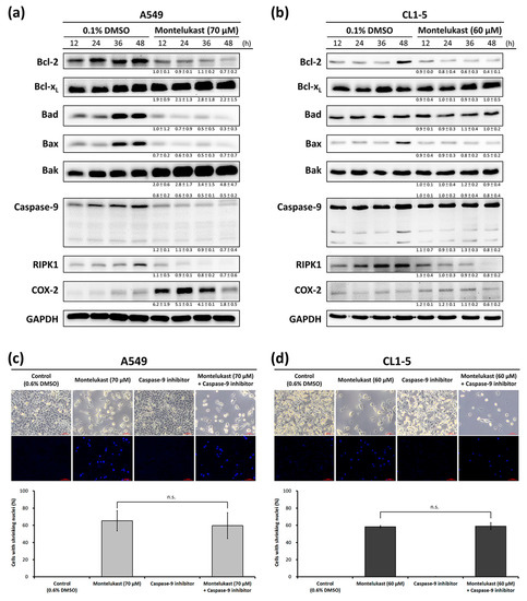 To investigate the possible mechanisms of the montelukast-induced cell death of lung cancer cells, the expression levels of apoptosis-associated proteins were analyzed with immunoblot. Montelukast treatment markedly decreased the expression of Bcl-2 and markedly increased the expression of Bak in a time-dependent manner in A549 and CL1-5 (Figure 3a,b). However, the changing trend in the expression levels of Bcl-xL, Bad, and Bax was not compatible with classical apoptosis. The expression level of caspase 9 was markedly decreased in A549, but not in CL1-5. By pretreating the cells with a specific inhibitor of caspase 9, the caspase-9-independent nature of the montelukast-induced cell death of lung cancer cells was confirmed (Figure 3c,d). In addition, the expression level of RIPK1 was markedly decreased in montelukast-treated cells, excluding the participation of necroptosis in montelukast-induced cell death (Figure 3a,b). Interestingly, the expression level of cyclooxygenase-2 (COX-2) was markedly increased in montelukast-treated A549 cells (Figure 3a,b).