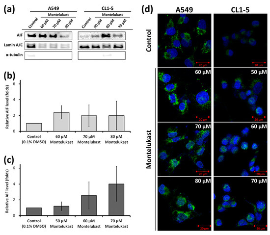 Montelukast-induced nuclear translocation of apoptosis-inducing factor (AIF) in lung cancer cells. (a–c) The cells (A549 and CL1-5) were treated with 0.1% dimethyl sulfoxide (DMSO) (control) or montelukast for 24 h. The levels of AIF in the nuclei were assessed with immunoblot assay. The results shown are representative photographs (a) of multiple experiments, along with the means ± SD of the relative levels to the lamin A/C levels and to the control groups (b, A549; c, CL1-5); (d) The cells (A549 and CL1-5) were treated with 0.1% DMSO (control) or various concentrations of montelukast for 24 h. The nuclear translocation of AIF was demonstrated with immunofluorescence staining and laser scanning confocal microscopy. Blue, DAPI-labeled nuclei; green, AIF.